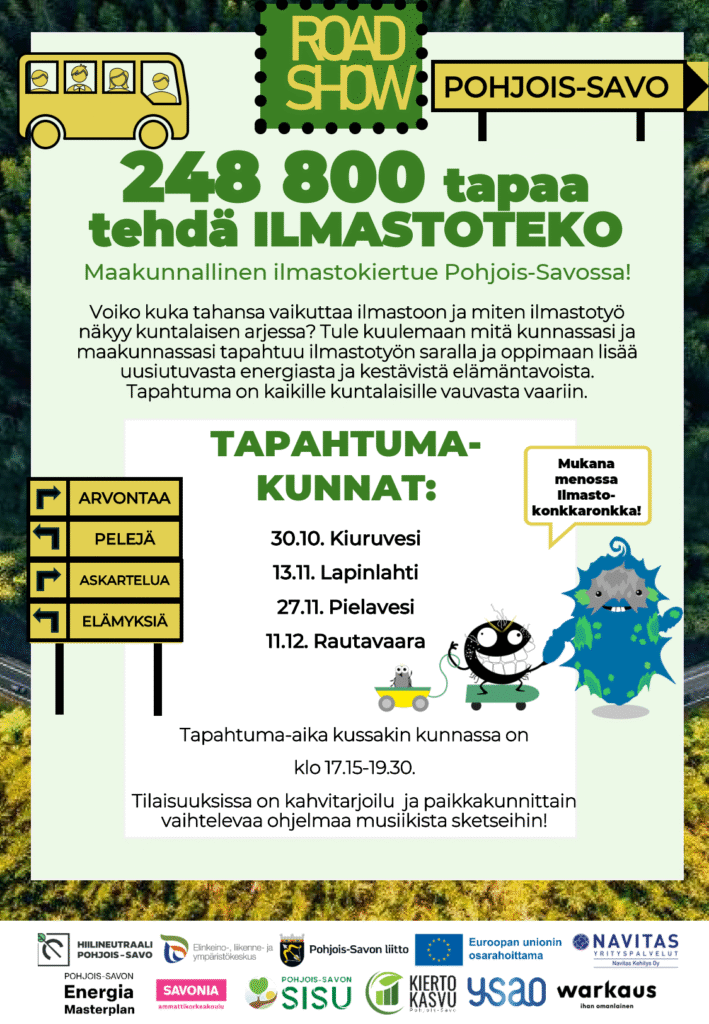 Pohjois-Savossa on käynnissä useita maakunnallisia ilmasto- ja uusiutuvan energian hankkeita. Nyt hankkeet jalkautuvat neljään kuntaan keskustelemaan ja jakamaan tietoa alueellisesta ja ilmastotyöstä kaikille kuntalaisille suunnatuissa iltatapahtumissa. Kiertueen aikana kierretään Kiuruvedellä, Lapinlahdella, Pielavedellä ja Rautavaaralla. Luvassa ei ole perinteisiä hanke-esittelyjä ja tietoiskuja, vaan mukavaa toimintaa muun muassa kulttuurielämyksiä, pelejä, askartelua, tuulivoimavideoita ja arvontaa – pullakahveja unohtamatta. Tule piipahtamaan, vietetään mukava syysilta kestävien elämäntapojen äärellä!