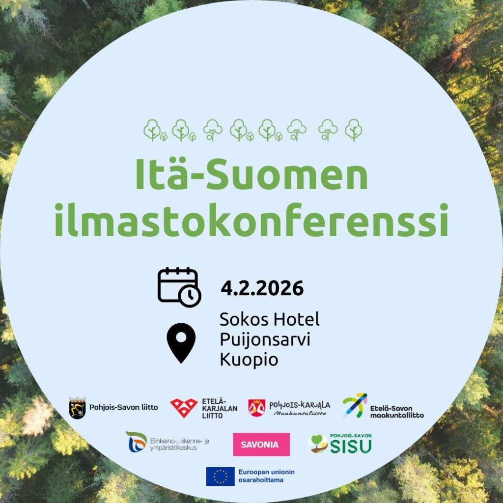Vuosittainen Itä-Suomen ilmastokonferenssi järjestetään Kuopiossa 4.2.2026. Neljännen kerran järjestettävän konferenssin teemana on ilmastokestävät alueet ja kunnat. Tilaisuudessa esitellään esimerkkejä vaikuttavasta ilmastotyöstä ja työkaluista ilmastonmuutokseen sopeutumiseksi. Lisäksi tapahtumassa keskustellaan oikeudenmukaisesta siirtymästä kohti ilmastokestäviä alueita ja kuntia.